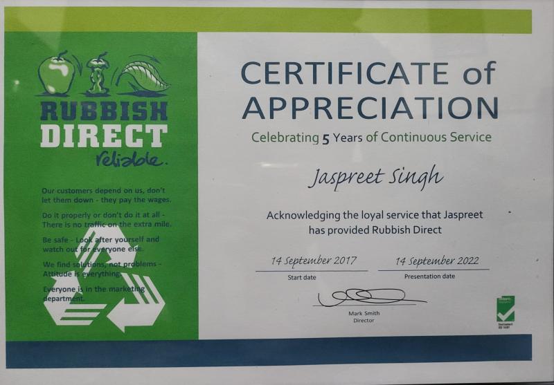 We are thrilled to celebrate Jaspreet’s five-year anniversary with us at Rubbish Direct.