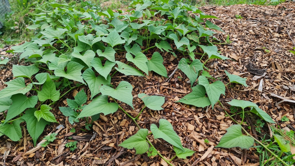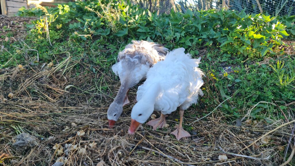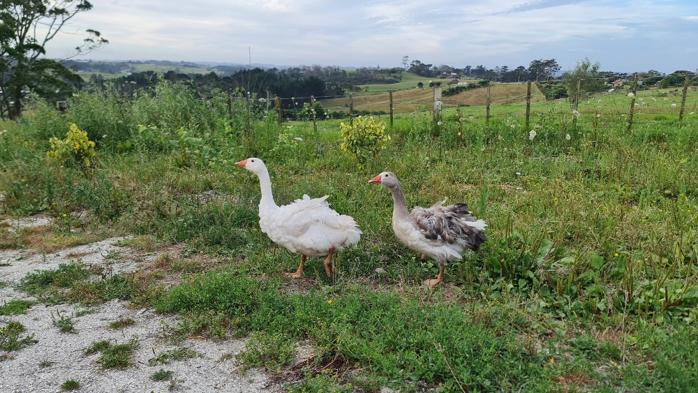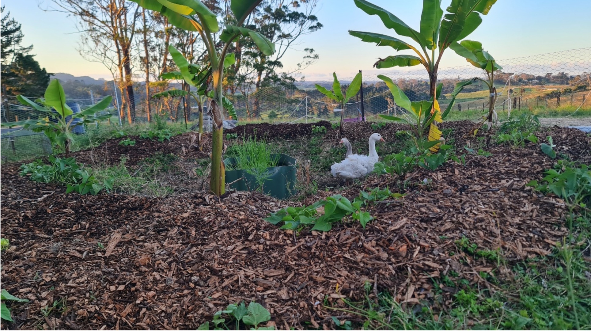 So, we’ve introduced a variety of other plants and animals in this space to help maintain the area to ensure minimal human requirement. We have planted kumara, to keep weeds down (yes to less weeding!!), lots of lots of fresh arborist mulch to also help suppress weeds, provides nitrogen for the bananas and keeps the area moist, 2 x Sebastopol geese who love eating grass and weeds. They require fresh water, so all their dirty water is used to fertilise the bananas (no waste here!). I am just in the process of introducing Khaki Campbell ducks, who eat grass and need fresh water.