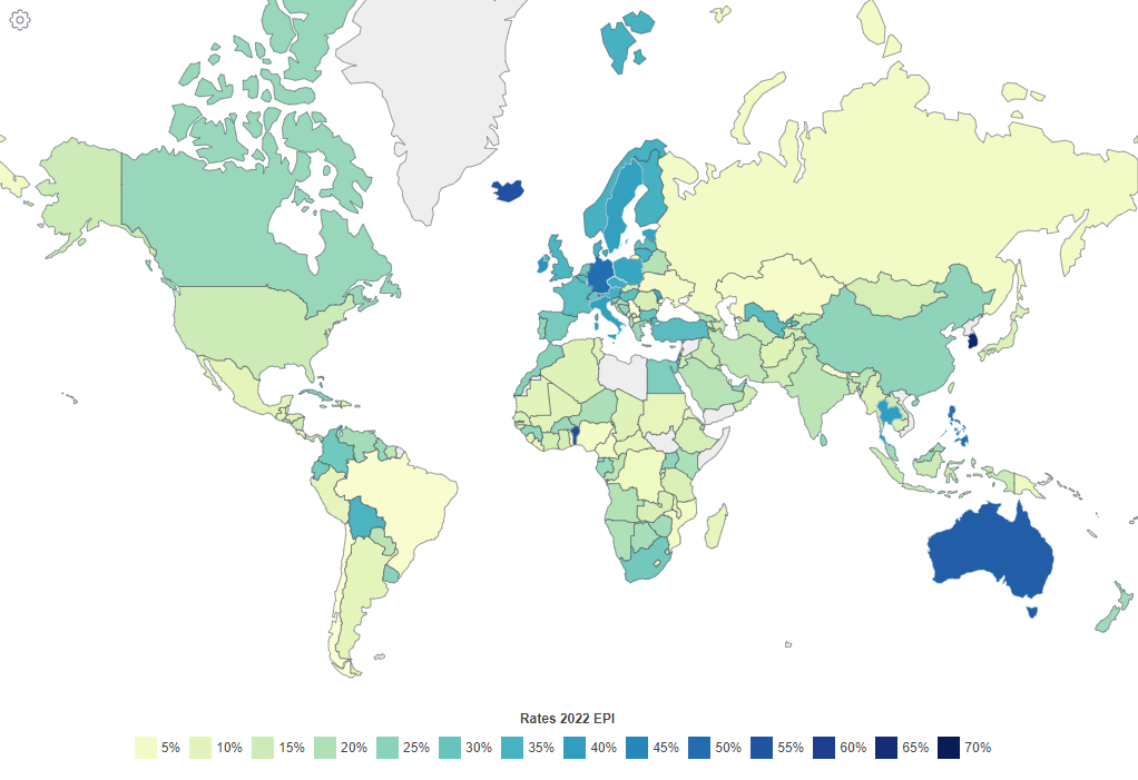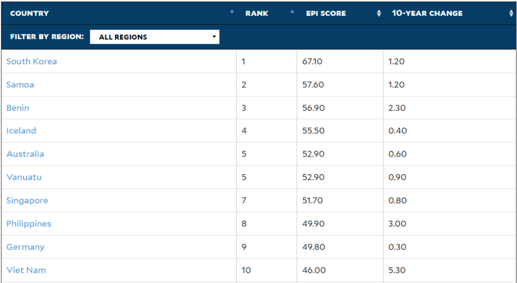Based on the Rates 2022 EPI report, South Korea, Samoa, Benin, Iceland, Australia, Vanuatu, and Singapore have recycling rates of over 50%. South Korea has the highest recycling rate of approximately 67.1%, which is considerably higher than some of the European countries on the list.